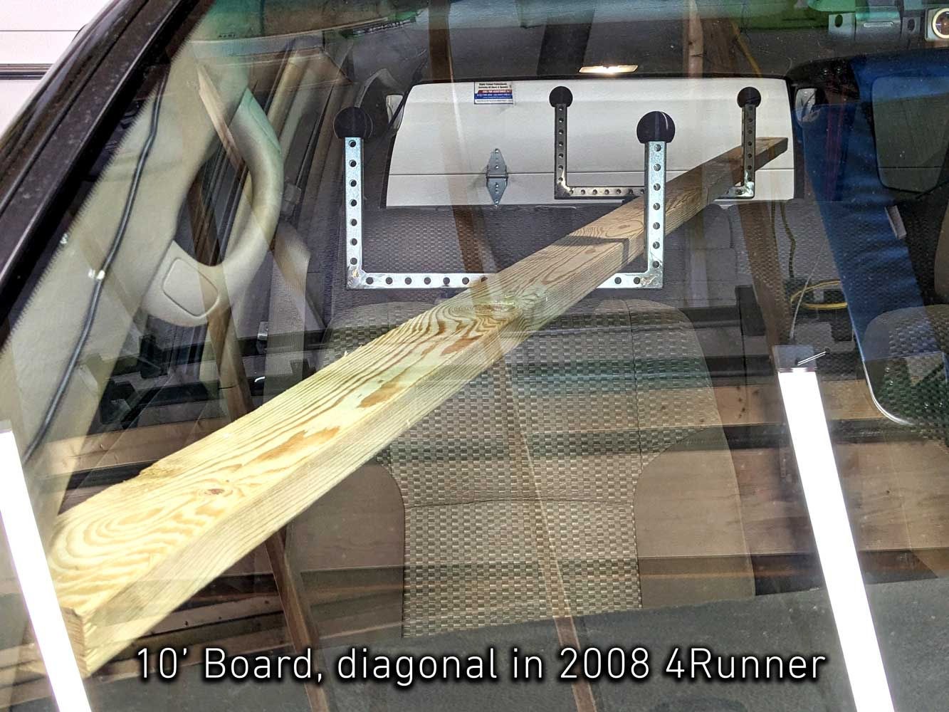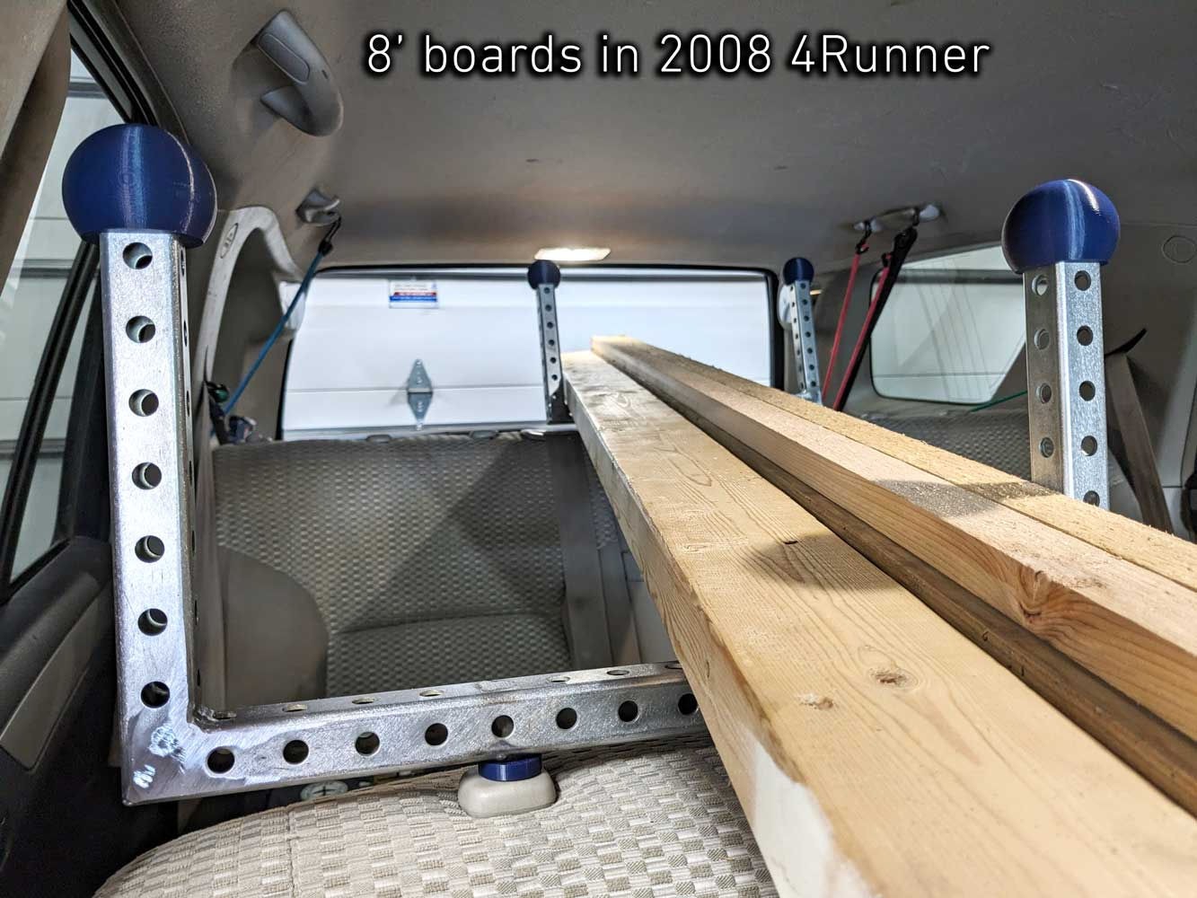 Pair two SeatRacks together to span from the front passenger seat to rear passenger seats (~9′ length in compact to mid-size SUVs). Or for a little longer capacity, go diagonally from the front seat through the center rear seat (~10′). Will fit up to sixteen 2x4s, eight 2x8s*.